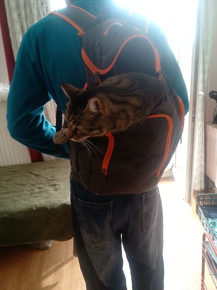 An indoor scene in Strasbourg, France, depicts the back of a person wearing a teal long-sleeved shirt and blue denim jeans. A dark gray backpack with orange trim and zippers is worn on their back. A brown tabby cat is positioned within the backpack, with its head and front paws visible, gazing towards the lower right. To the left, a portion of a bed or bench covered in wrinkled olive green fabric is present. To the right, a brightly lit doorway or opening is visible, revealing a light-colored curtain, a section of a black plastic crate, and a red-framed object on a wooden floor. Strong ambient light from the right side of the frame causes a significant glare in the upper center and right portions of the image.