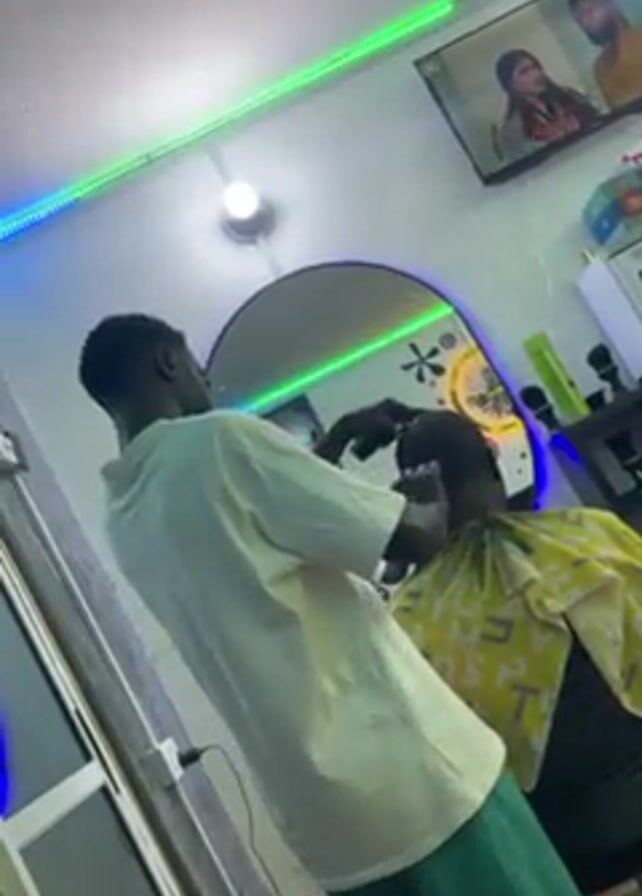 In a brightly lit barbershop, a man is getting a haircut. The barber, dressed in a white t-shirt and green pants, is standing behind his seated client, using clippers to trim the hair. The client is draped in a yellow and white patterned barber's cape. A large, round mirror with decorative accents hangs on the wall behind them. Above the mirror, a television displays a video. The walls are adorned with green and blue LED strip lights. A sliding glass door is visible to the left.