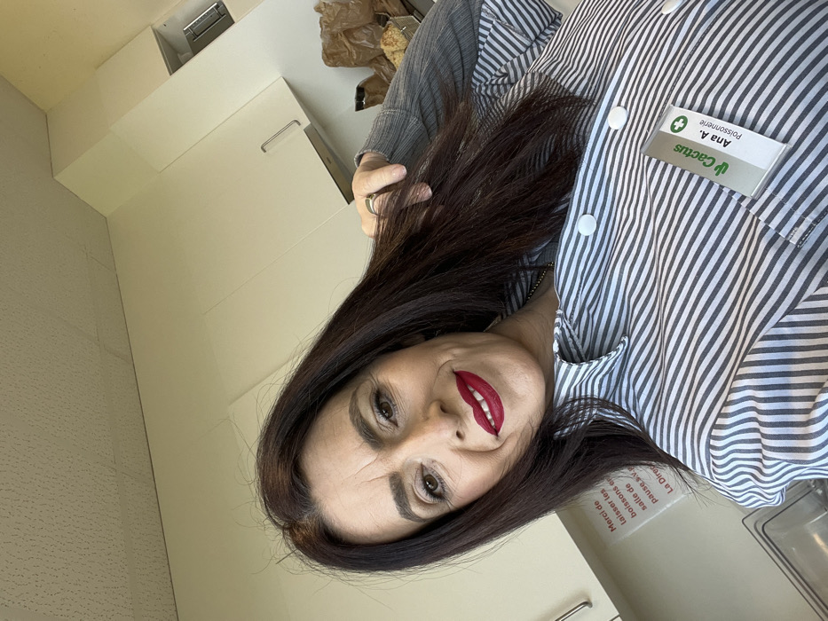 A medium-shot portrait depicts a smiling adult female with dark hair and red lipstick, looking directly at the camera. She wears a grey and white striped collared shirt. A name tag affixed to her shirt identifies her as "Ana A." and states "Cactus Poissonnerie." Her left hand, wearing a ring on the ring finger, is positioned near her hair. The background indicates an indoor environment, specifically a break room or kitchen area within a Cactus supermarket in Mensdorf, Luxembourg. Elements visible in the background include a light-colored acoustic tile ceiling, white upper cabinets with silver bar handles, and a light-colored countertop. A brown paper bag containing pastries is present on the countertop to the right. To the left, a wall-mounted sign in French states "Merci de laisser les boissons en salle de pause s.v.p. La Direc..." (Thank you for leaving drinks in the break room please. The Direc...), confirming the function of the space. A metallic food service container is partially visible below the sign.