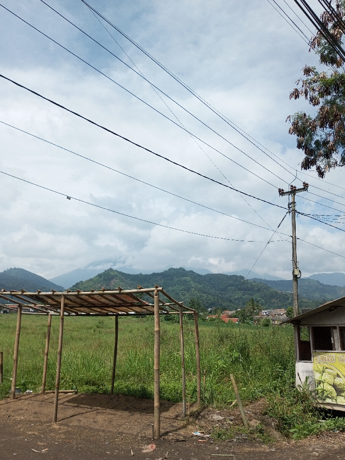 The image depicts an outdoor, static scene captured during daylight in Ariyalai, Sri Lanka. The foreground features an unpaved, dark dirt ground with scattered light-colored debris. To the left, a rustic, open-sided bamboo-framed shelter or stall stands on the dirt, topped with a thatched or woven roof. To the right, partially visible, is the side of a small, white, single-story kiosk structure with a yellow sign containing green text and imagery, partially legible as "TAHU GA" or similar. Behind these structures, an expansive field of tall green grass occupies the midground. In the distance, scattered buildings with reddish-brown roofs are visible amidst the greenery. The background is dominated by a range of lush, green mountains, with some peaks partially obscured by light clouds. The sky above is largely overcast with white and grey clouds, interspersed with patches of lighter blue. Overhead, multiple black utility wires crisscross the frame, converging towards a wooden utility pole on the right side, which also has an attached electrical box. A portion of a tree with sparse, brownish-red foliage is visible in the upper right quadrant. No people or animals are present, and no overt actions are occurring.
