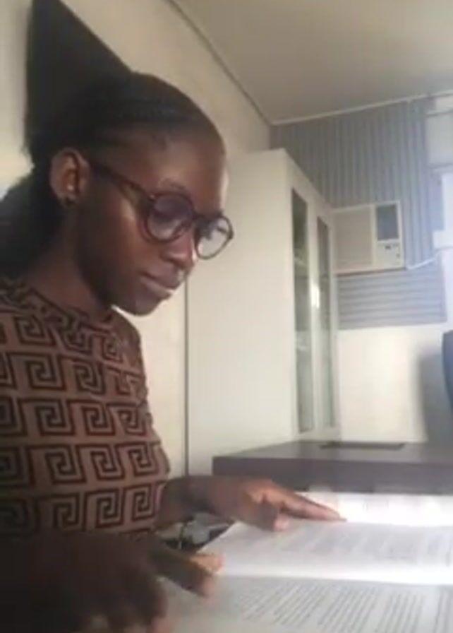 young woman seated at a desk, reading. She is wearing glasses and has her hair styled in braids. She is wearing a brown patterned shirt. There are books on the desk in front of her. After reading, she closes the book, then brings her hands to her face. The room appears to be an office, with a white cabinet and an air conditioning unit in the background. The lighting is bright, suggesting daytime.