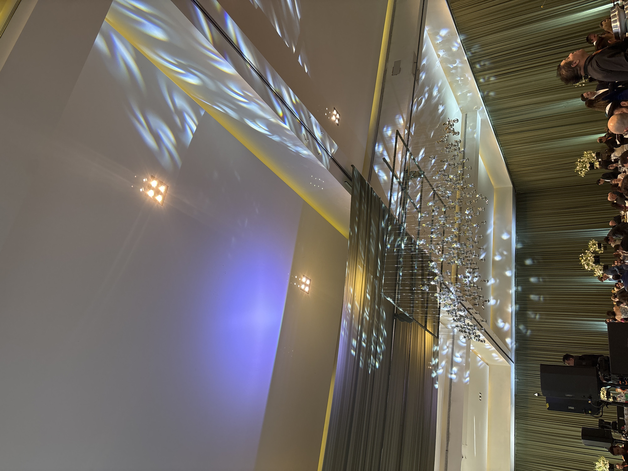This image depicts a large, indoor event space, likely a ballroom or hall, within Mexico City, Mexico. The specific location within Mexico City cannot be determined from the visual evidence. The scene is dominated by an elaborate ceiling featuring multiple architectural planes with gold-colored trim and recessed lighting. Dynamic light patterns, varying in shades of white, blue, and yellow, are projected across the ceiling surfaces, creating a luminous, patterned effect. A significant portion of the upper left ceiling area is bathed in a distinct blue light. A large, multi-tiered chandelier, composed of numerous small, reflective, spherical elements, hangs centrally, casting light reflections. Several square-shaped light fixtures, each containing multiple bulbs, are visible on the ceiling planes. The walls are covered with tall, pleated drapes in a sage green or olive green color, extending from the floor to the ceiling. In the lower half of the frame, numerous individuals are gathered, suggesting a formal event. Many are seated at tables arranged throughout the space. White floral arrangements, possibly centerpieces, are visible on some tables. On the far left, a sound setup is present, including large black speakers on stands and a person standing behind them, appearing to operate equipment. In the foreground on the right, a man in a black shirt is visible from the chest up, looking upward towards the ceiling. The attendees are dressed in formal or semi-formal attire, interacting and observing the event. The overall environment suggests a celebratory or social gathering.