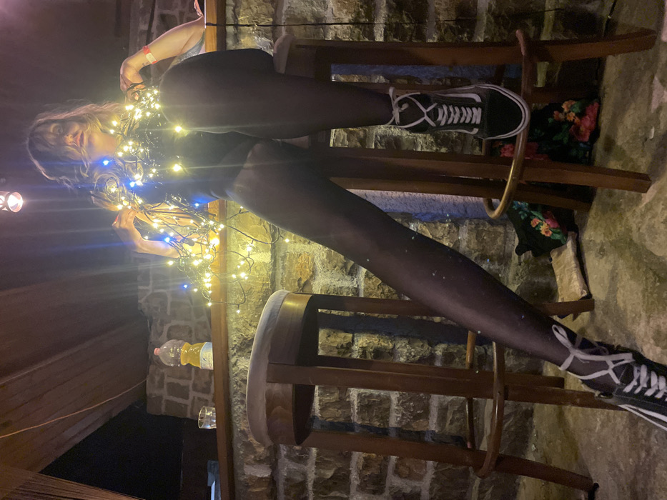 A young woman with blonde hair stands in a dimly lit room, adorned with twinkling fairy lights wrapped around her torso. She is wearing a black bodysuit, dark tights, and black and white sneakers. She stands with one foot on each of two tall wooden chairs. A stone wall is visible in the background.