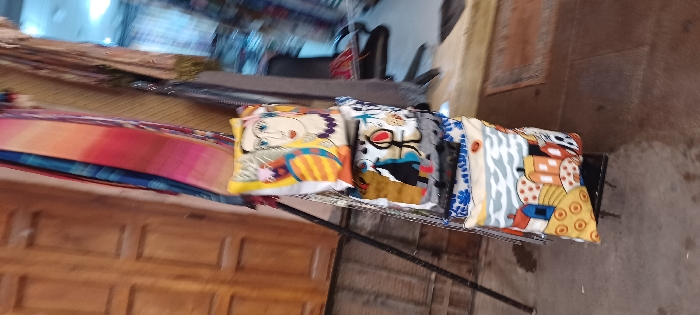 The image captures a street-level commercial display in Marrakesh, Morocco. Four distinct, square decorative cushions are stacked vertically on a dark-colored metal display stand. The uppermost cushion features a stylized, abstract depiction of a human face with bright yellow, orange, and blue elements. The second cushion from the top presents abstract dark figures and red shapes against a lighter background. The third displays a blue and white floral or geometric pattern. The bottom cushion illustrates a vibrant, abstract landscape with colorful buildings and textured hills. To the left of the display stand, a closed wooden door with two vertical panels is visible, situated above a stone or concrete ground with damp areas. To the right, the entrance to a retail establishment is discernible, showcasing a blurred arrangement of colorful hanging textiles, including reds, blues, and browns, and a dark chair positioned within the interior. The overall image exhibits moderate blur, indicating motion or shallow depth of field.