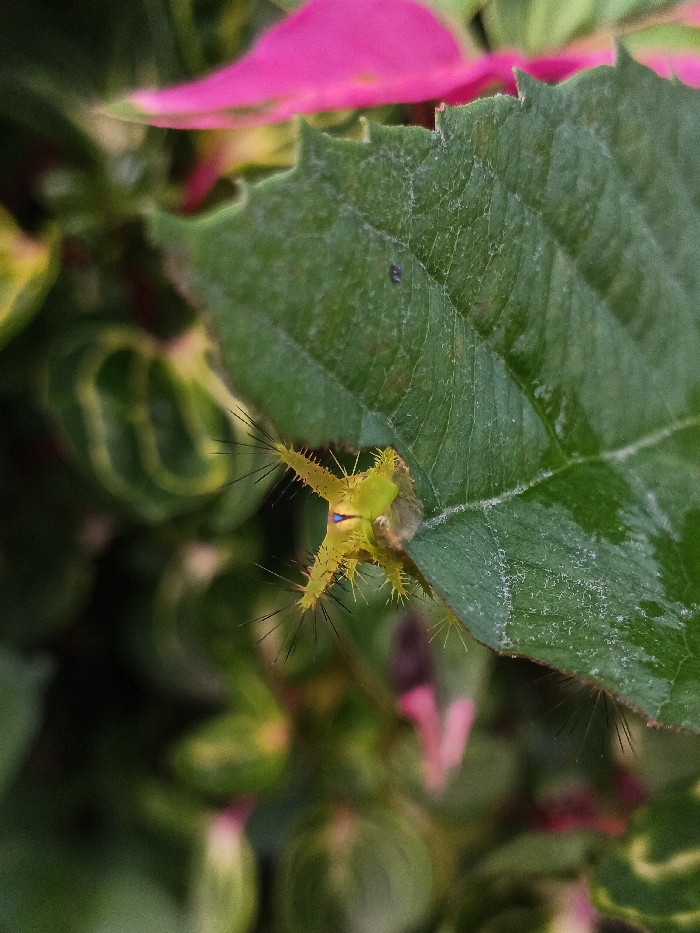 A highly detailed macro shot captures a bright lime-green or yellowish-green caterpillar, likely a slug caterpillar (Limacodidae family), positioned on a dark green leaf. The caterpillar exhibits a distinctive star-like morphology, covered in numerous sharp, black-tipped spines radiating from its body. A small, vivid blue marking is visible on its dorsal surface. It appears stationary, partially attached to or emerging from a section of the leaf, which displays clear venation and a slightly irregular edge. A small, dark speck is visible on the leaf's surface above the caterpillar. The background is rendered in soft focus, revealing a mixture of blurred green, yellow-green, and bright pink foliage, indicating a vibrant botanical environment.