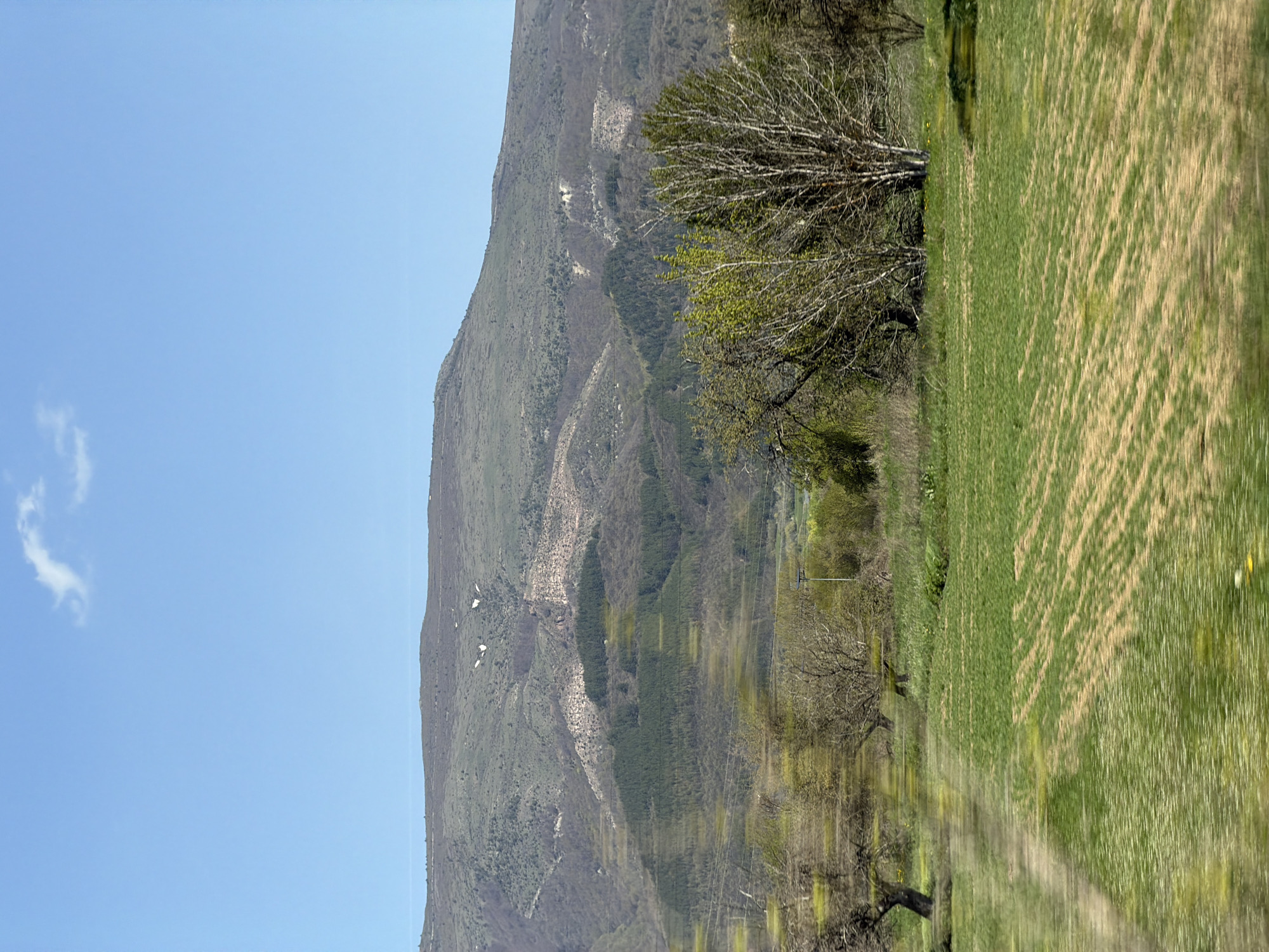 The image displays a landscape scene near Mirkovo, Bulgaria. On the left is a clear blue sky with a small white cloud. The background is dominated by a large mountain covered in green vegetation, showing signs of erosion in the form of lighter-colored scars running down its slopes. Adjacent to the mountain, a meadow stretches out, displaying a mixture of green and brown vegetation. Several bare trees with intricate branch patterns are scattered along the boundary between the meadow and the mountain.