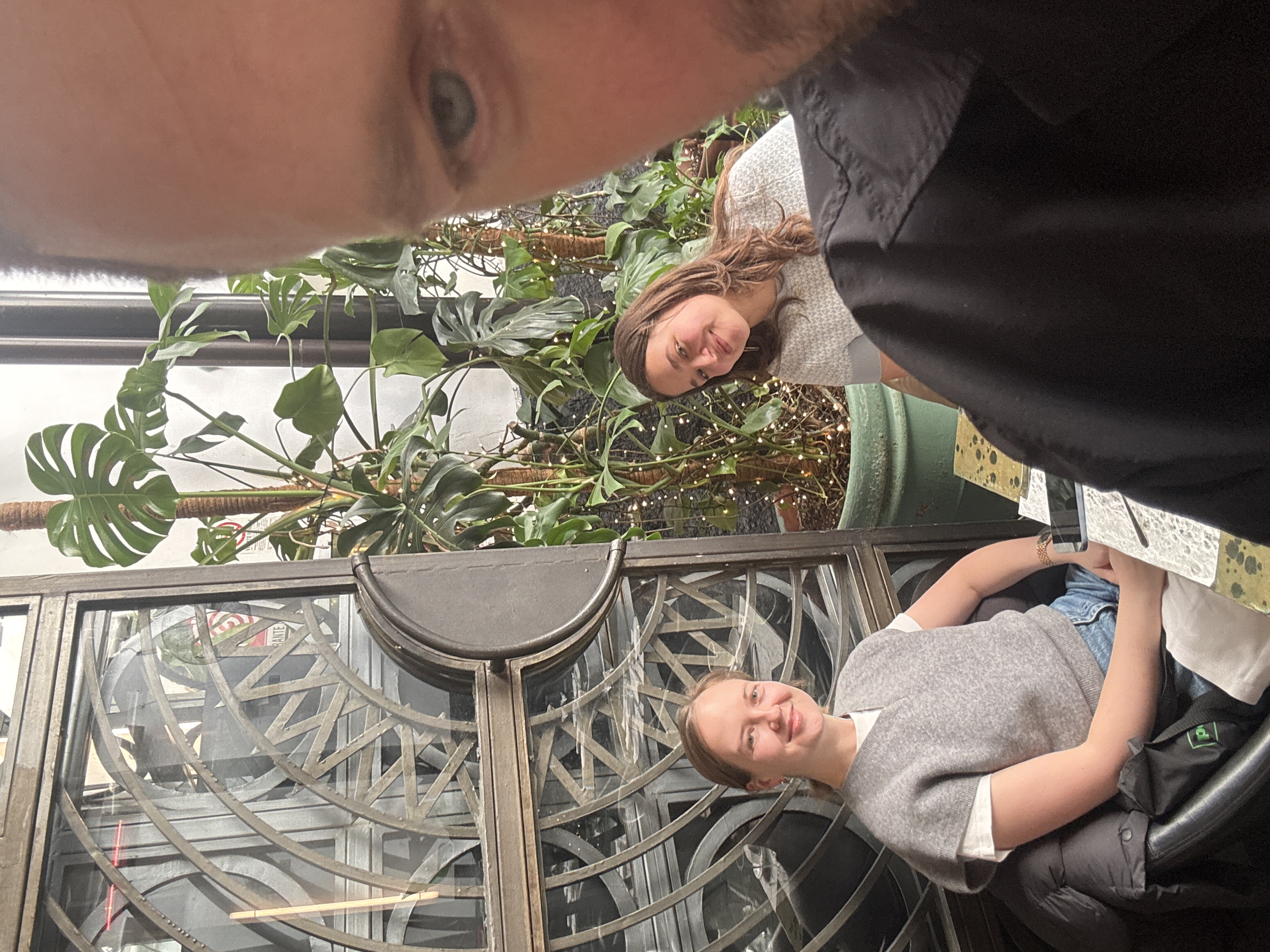 An indoor, close-up photograph captures three individuals within an establishment, likely a cafe or restaurant, in Milan, Italy. The foreground, upper right, is dominated by the out-of-focus forehead, right blue eye, and dark-clad shoulder of a male individual, who appears to be taking the photograph. Two women are seated at a table, smiling directly at the camera. The woman on the left, with light brown hair, wears a gray sweater vest over a white t-shirt, and blue jeans are visible. She rests her hands near a distinctive table surface featuring a mottled greenish-gold pattern, partially covered by a white, translucent placemat with an intricate lace-like pattern. A light-colored smartphone lies face-down on the placemat, next to a dark utensil. The second woman, partially visible to the right and behind the first, has wavy brown hair and wears a light gray top with a repeating geometric pattern. The background on the left reveals an ornate, dark metal framework with glass panels, displaying a partial sign with the letters "RANTE," indicating an Italian establishment. To the right, large potted Monstera plants, trained on brown coir poles, are adorned with numerous small, warm-white string lights. The pot for one plant is a weathered green. Natural light illuminates the scene.