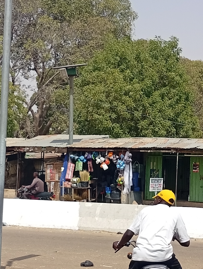 This image depicts a daytime street scene in Zango, Nigeria, showing a commercial area with shops and individuals. In the immediate foreground, a person wearing a white short-sleeved shirt and a yellow baseball cap is seated on a black motorcycle, viewed from the rear, facing towards the right side of the frame. The motorcycle's handlebars are visible. On the asphalt road surface, a dark, indistinct object rests near a light-colored concrete barrier that spans horizontally across the midground. To the left of the foreground, a tall, grey vertical pole (likely a street light pole) stands. Behind the concrete barrier, a row of small, informal shops is visible. These structures feature corrugated metal roofs and primarily wooden or metal frames. The central shop displays various merchandise, including colorful plastic buckets, bowls, and other household items hanging from the eaves, alongside bundled brooms or brushes arranged on a low table. To the far left, another individual is seated on a red motorcycle, facing left, partially obscured by the shop's structure. This person is wearing a dark-colored long-sleeved shirt. The rightmost shop features two green, closed doors, with a partially visible white sign attached to one. In the background, dense green foliage from multiple trees dominates the upper portion of the frame. A tall, grey street lamp pole with a solar panel array mounted atop it is positioned above the shops, slightly to the left of center. The sky above is clear and light blue. The scene is brightly illuminated, indicating full daylight.