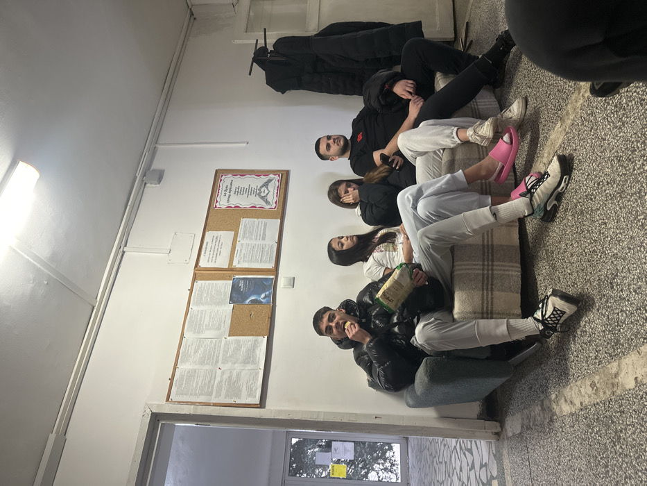 This image depicts an interior scene, likely a waiting area or common room, located in Pravets, Bulgaria. The environment features white-painted walls and ceiling. A single rectangular fluorescent light fixture is mounted on the ceiling. Electrical conduit runs horizontally along the upper part of the wall. The floor is composed of dark gray or black speckled material, possibly terrazzo or worn concrete, with a noticeable light-colored seam or crack traversing it horizontally in the foreground. On the main wall, two bulletin boards are displayed. The larger, left-hand board contains multiple documents pinned, primarily text-based, in what appears to be Cyrillic script. A poster with a blue, possibly cosmic or abstract, image is also pinned to this board. To its right, a smaller cork board section contains further documents, including one framed poster featuring a stylized heart formed by two hands, also with Cyrillic text. Below the bulletin boards, a light switch or outlet is visible. To the left, an open doorway leads to another area, revealing what appears to be an exterior view through a window, possibly showing snowy conditions or very bright daylight. A yellow notice or sign is partially visible on a surface beyond this doorway. To the far right, a dark winter coat or jacket hangs on a wall-mounted hook. Four individuals, three males and one female, are seated side-by-side on an upholstered two-part couch. The left section of the couch is a plain light blue-gray, while the right section features a beige and white plaid pattern. A fifth individual's lower leg and foot, clad in dark clothing and a black shoe, are partially visible in the bottom right foreground, suggesting another person is seated out of frame. From left to right: 1. **Individual 1 (Male):** Wearing a shiny black puffer jacket, light grey sweatpants, and black and white athletic shoes. He is actively eating from a partially visible bag of chips, holding a light green and yellow bag in his left hand while bringing a chip to his mouth with his right. His gaze is directed slightly upwards and to the right. 2. **Individual 2 (Female):** Dressed in a white short-sleeved top and light blue sweatpants. Her left foot wears a white athletic shoe with black and teal accents, while her right foot is shod in a bright pink slide sandal. Her long dark hair is parted down the middle. She is looking towards the right. 3. **Individual 3 (Female):** Wearing a black long-sleeved top or jacket and light grey sweatpants. Her long dark hair is down. She is leaning forward, resting her chin on her left hand, and holding a dark-colored smartphone in her right hand. Her feet are not visible. 4. **Individual 4 (Male):** Wearing a black short-sleeved t-shirt with a small red emblem on the left chest, and dark-colored pants. A dark jacket is draped over his lap. He has short dark hair and a beard. He is looking straight ahead or slightly to the right. His feet are in dark athletic shoes.