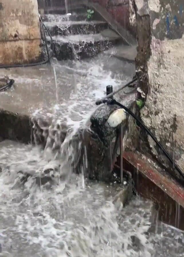 water cascading down a set of concrete stairs during a heavy rainstorm. The stairs are flanked by weathered walls, with exposed brick and peeling paint visible. The water is churning and frothy as it flows downwards. A black cable is seen running along the side of the stairs. The camera pans upwards, showing the heavy rain and a view of rooftops and buildings in the distance, obscured by the downpour.