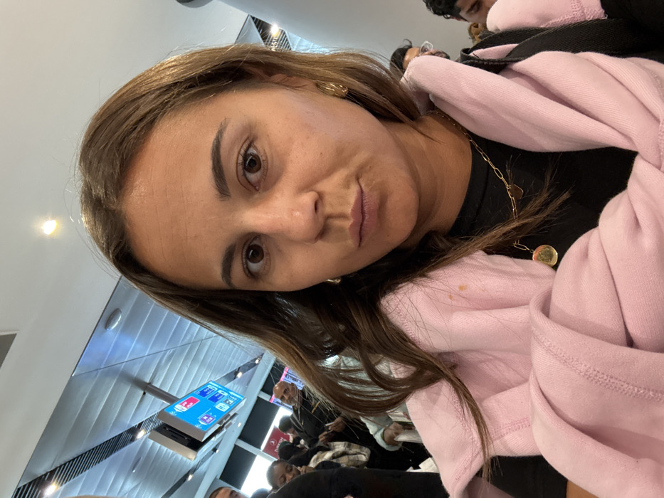 The image depicts an indoor scene within Istanbul Airport (IST), located in Arnavutköy, Turkey. The foreground is dominated by a selfie of a woman with medium brown hair and brown eyes, wearing a black top, a gold chain necklace with a heart charm and a circular pendant, and gold hoop earrings. A light pink sweatshirt, displaying a small reddish-brown stain on its left side, is draped over her shoulders. Her expression is neutral, with a slight pout. In the background, a crowd of individuals is visible, suggesting a waiting area or queue. Notable figures include a bald man with a mustache and glasses looking towards the camera, a woman in a black and white checkered shirt, and other partially obscured individuals. Overhead, a modern, paneled ceiling with recessed lighting is visible. A digital display screen showing various colored segments (red and blue) hangs from the ceiling, likely indicating flight or queue information. Below the display, a red sign with white text partially displays "Turkish Airlines." The environment is brightly lit by artificial light.