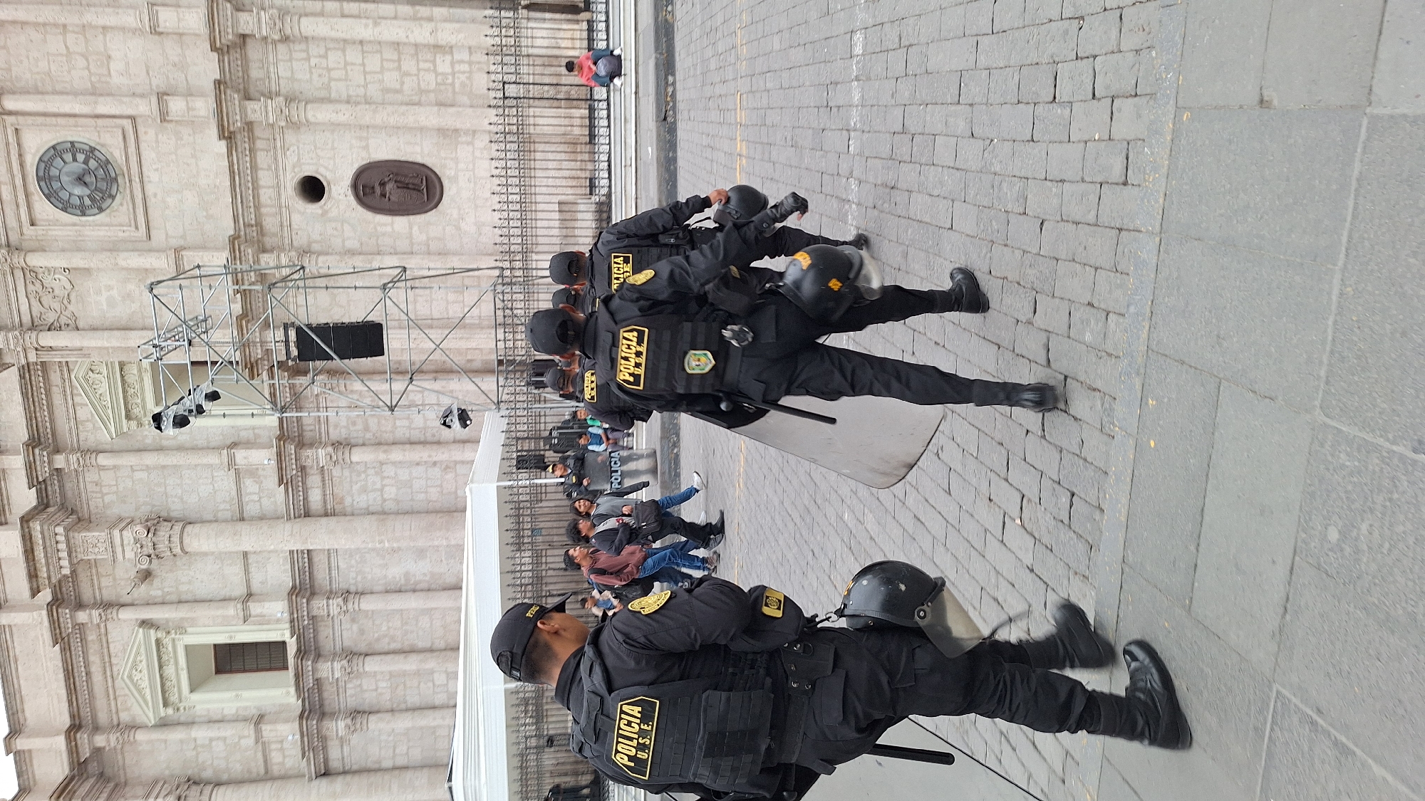 The image captures a daytime scene on a cobblestone street in front of the Arequipa Cathedral on the Plaza de Armas in Arequipa, Peru. Multiple police officers in black tactical uniforms, vests displaying "POLICIA U.S.E." in yellow lettering, and black baseball caps are walking from left to right across the street. Most officers are seen from behind, carrying black riot helmets in their hands, with at least two also holding rectangular grey riot shields. The officer closest to the camera on the left has "FERO" on his cap. In the background, several civilians in casual clothing are visible, walking past the officers. One civilian is seated on a stone ledge near a black metal fence on the far right. The backdrop is the light-colored sillar stone facade of the Arequipa Cathedral, characterized by classical columns, arched windows, a circular clock near the top right, and a relief medallion. A tall, silver-colored metal scaffolding structure supporting dark speakers and spotlights is erected in front of the cathedral. A white tent is partially visible behind the metal fence. The ground transitions from grey concrete paving in the immediate foreground to cobblestones where the police and civilians are walking.