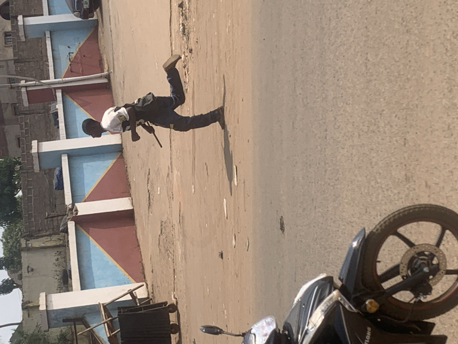 A dark-complexioned male individual is depicted in Aguleri, Nigeria, in a running posture from left to right across a mixed-surface road during daytime