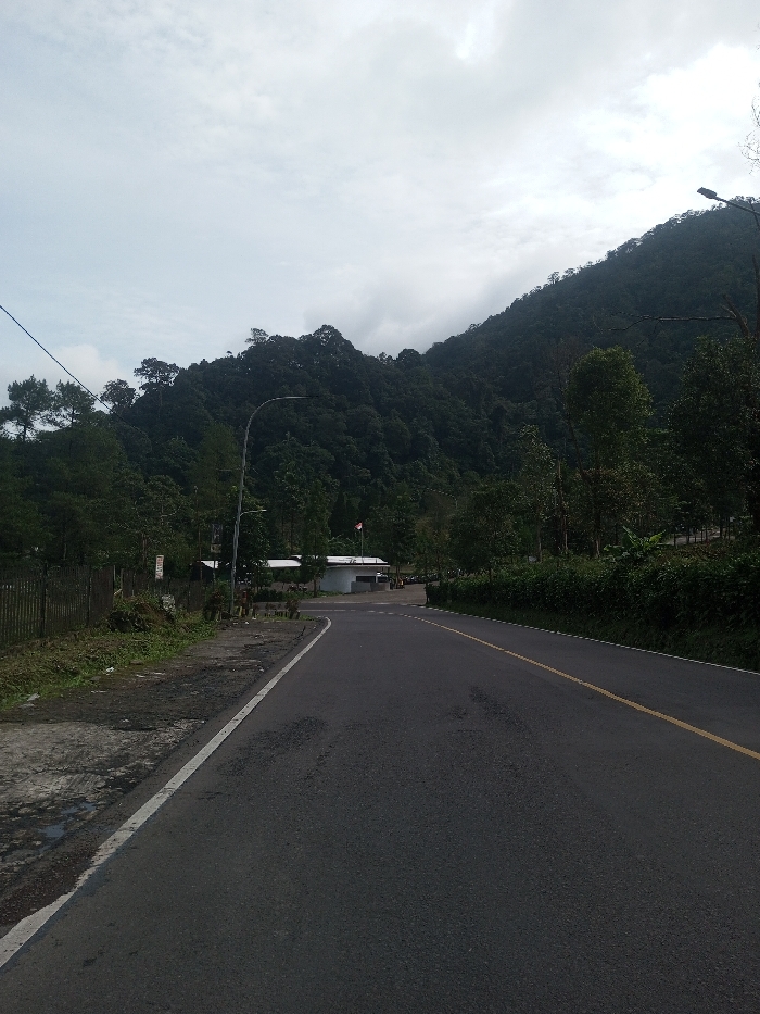 The image displays an asphalt road leading into a forested mountainous area, located in Thanthirimale, Sri Lanka. The two-lane road features a solid white line on its left edge and a solid yellow center line, extending into the midground where it appears to curve right towards a complex of buildings. To the immediate left of the road is a damp dirt shoulder, bordered by a dark corrugated fence. Behind the fence, dense green trees, including some conifers, are visible. A grey streetlight pole stands on the left side of the road in the midground. Further down the road, a cluster of low-rise, light-colored buildings with dark roofs is present on the right, near which a flagpole displays a flag with horizontal red and white stripes. Several indistinct vehicles are parked near these structures. The background is dominated by a heavily vegetated mountain range, covered in dense dark green foliage. The sky is overcast with varying shades of grey clouds. No individuals are visible.