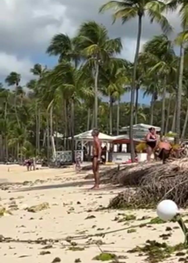The video depicts a beach scene with numerous palm trees, a small white building, and several people in the background. In the foreground, an adult male in black swimwear is seen performing squats on the sandy beach. The beach is partially covered with seaweed or other vegetation. There is a white buoy anchored on a pole in the right foreground. The sky is partly cloudy.