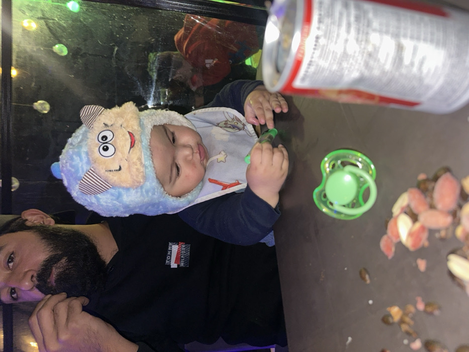 A baby in a sheep-themed hat and bib sits next to an adult in a Tommy Hilfiger shirt. The baby holds a small, green object. A green pacifier and a pile of food scraps are on the table. A can is partially visible in the upper right corner. A blurry reflection of a red object appears in the background near lights.