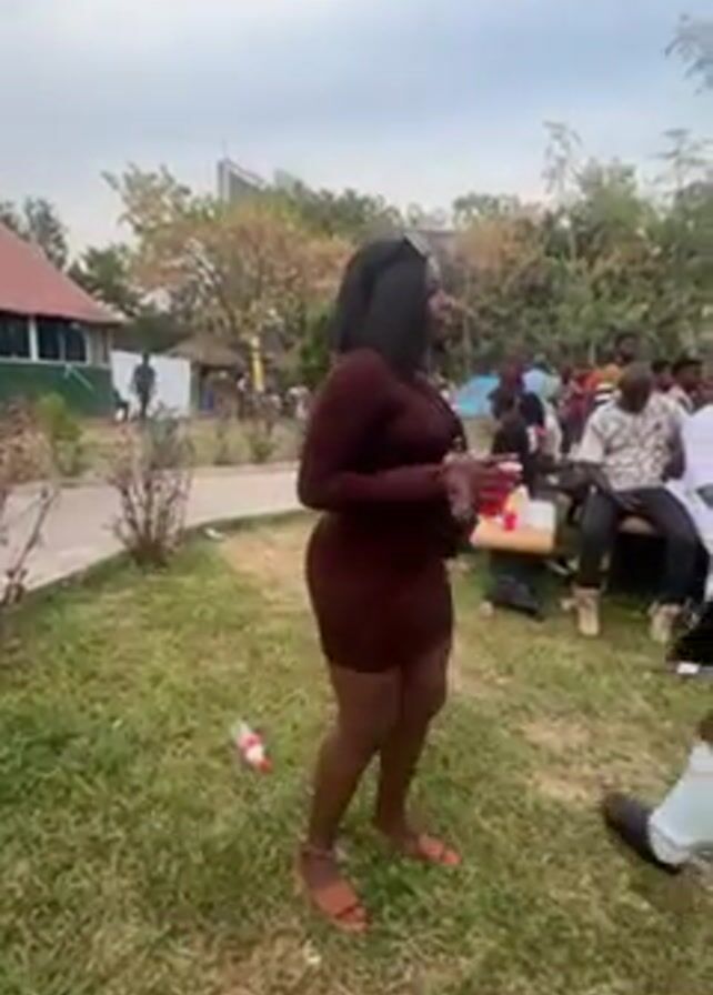 woman in a brown dress dancing in a grassy park setting. She is surrounded by other people, some of whom are seated. The park has trees, buildings, and scattered trash. The woman appears to be enjoying herself as she dances to music. She is holding a cup and a small, fuzzy object. The weather appears overcast.