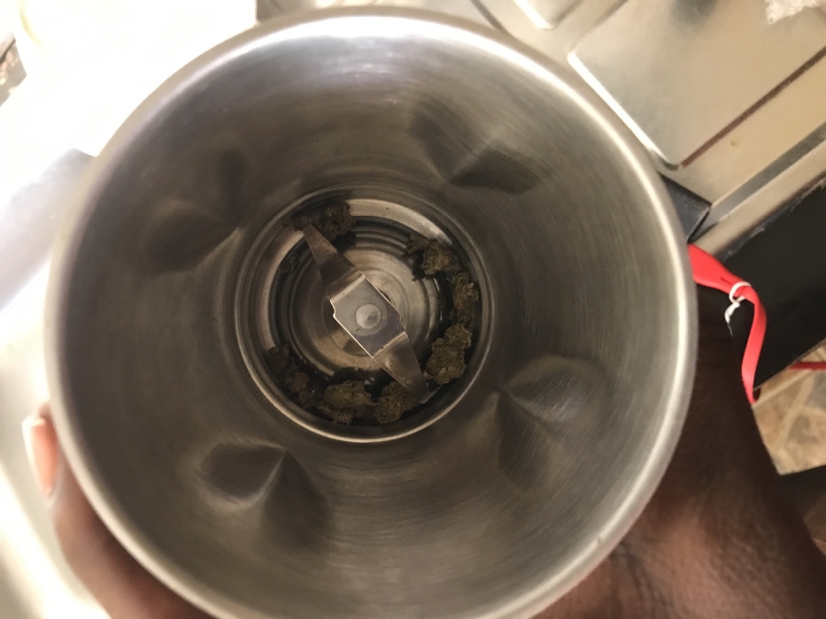 This image captures an overhead perspective of a person's left hand holding a metallic grinding cup, located in an indoor setting within the city of Galadimawa, Nigeria. The interior of the cylindrical, silver-toned cup reveals a central two-blade metal grinding mechanism surrounded by approximately seven to ten irregular clusters of dried green plant material, consistent with cannabis buds. The visible hand is dark-skinned, with a light-colored, manicured fingernail on the thumb. Portions of the immediate environment include a light-colored surface to the upper left and a dark, reflective surface with a red strap visible towards the lower right.