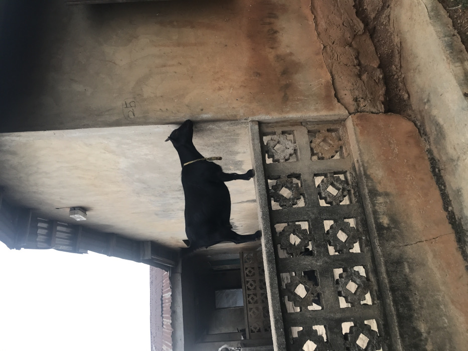The image depicts an outdoor scene in Aramoko-Ekiti, Nigeria. A black goat, adorned with a yellow-brown collar, stands atop a concrete balustrade. The goat's head is positioned against the corner of a light-colored, plastered building. The number "25" is hand-written in black on the building's wall. A white electricity meter box is affixed to the upper section of this wall, situated beneath the eaves of a corrugated metal roof. The lower portion of the building wall exhibits exposed reddish-brown material, indicative of sub-surface construction or significant plaster degradation. In the background, a multi-story structure with a corrugated metal roof and a balcony featuring a concrete balustrade with a decorative square-patterned design is partially visible. The ground level below the balustrade is composed of reddish-brown earth with a concrete footing. The sky is uniformly light gray, suggesting an overcast condition.
