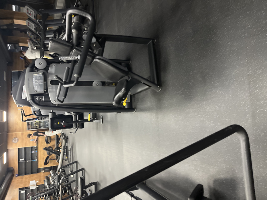 This image depicts the interior of a gym, in an unknown city and location. The floor is dark gray, speckled, and likely rubberized. Overhead lighting illuminates the space. In the immediate foreground, the base of a black metal exercise equipment frame is visible. A gray and black seated exercise machine with black padded upholstery and yellow adjustment knobs is prominently featured in the mid-right. To its left, another similar machine is partially visible. In the background left, a male subject with dark hair, wearing a dark shirt and light-colored pants, stands with his back partially turned, near a counter with shelves holding various items. Further in the far right background, a second subject, dressed in light-colored athletic wear, is actively using a treadmill or elliptical machine, facing away from the camera. Rows of free weights on racks, adjustable benches, and additional cardio machines are arranged throughout the gym. A round wall clock is visible on a textured wall in the background.