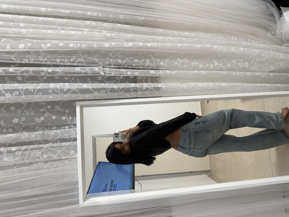 The scene depicts an indoor environment in Hod HaSharon, Israel. A female subject is captured in the reflection of a white-framed, full-length mirror, taking a selfie with a light-colored smartphone held to her face. She has long dark hair and is dressed in a black long-sleeved cropped top that exposes her midriff, paired with light-wash blue jeans. Her bare feet are visible at the bottom of the mirror's reflection. Behind her reflection, a white wall, a dark grey door frame, and a wall-mounted flat-screen television are visible. The television displays a blue screen with a multi-colored logo and discernible Hebrew text, consistent with an Israeli broadcast. To the immediate left and right of the mirror, white, translucent lace curtains with a repeating floral or vine pattern hang, suggesting a window or wall covering. The floor is light-colored tile.