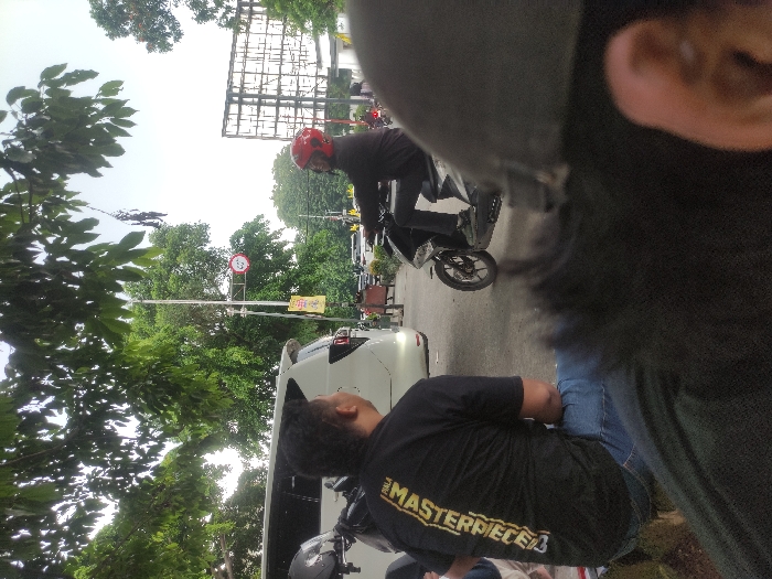 The image depicts an outdoor urban environment in Bogor, Indonesia, observed from a low perspective on a bright day. In the immediate foreground, a dark, out-of-focus head is partially visible on the right, suggesting the perspective of the photographer or an individual directly in front of them. To the left, a man is seated on a low curb or wall, seen from the back. He wears a black t-shirt with "MASTERPIECE" printed vertically in yellow on the back, and blue jeans, looking towards the right side of the frame. Behind him, the rear section of a white minivan or SUV is visible, parked or stopped. To the right, a person wearing a red full-face helmet, a dark long-sleeved shirt, and dark pants is seated on a silver scooter, facing right, paused in traffic. The background features an asphalt road with various vehicles, including cars and additional motorcycles. A tall pole displays a white circular sign with a red border and the number "40" in black, indicating a speed limit. Multiple yellow banners or flags are suspended from poles near this sign. Lush green foliage from large trees covers the top of the frame and forms dense tree lines in the mid-ground and background. A large, empty metal billboard structure is present in the far right background.