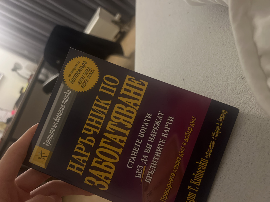 A hand, visible in the upper left, holds a book with a dark blue and purple cover featuring gold and yellow Cyrillic text