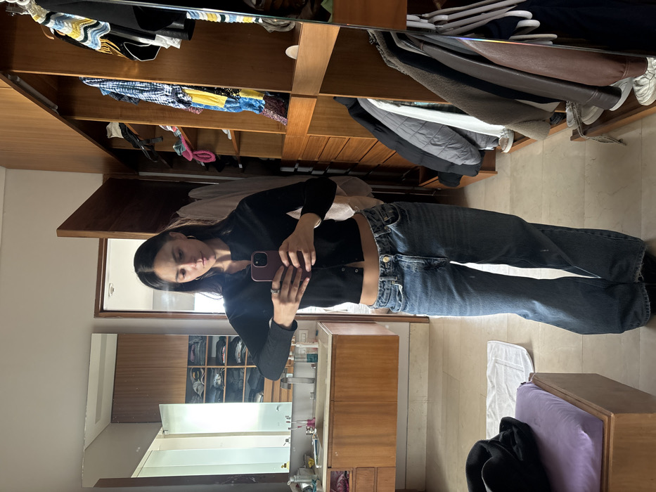 The scene depicts an adult female capturing a mirror selfie with a dark-colored smartphone within a private residence in Mexico City, Mexico. The subject, positioned centrally, has long dark hair, wears a black cropped cardigan, blue wide-leg jeans, gold hoop earrings, and a ring on her left ring finger. The large rectangular mirror reflects the subject and portions of two adjacent areas. To the left, a bathroom vanity features a light-colored countertop, a chrome faucet, and various toiletries above wooden cabinetry. A significant light source, consistent with a window, is reflected within this area, along with shelves containing folded clothing. To the right, an open walk-in closet constructed of light wood cabinetry displays a variety of clothing items on hangers and shelves, including jackets, colorful garments, and shoes. A dark item rests on a purple cushioned bench in the lower left foreground, beside a white cloth on the light-toned floor. The overall environment suggests a modern, organized dressing area.