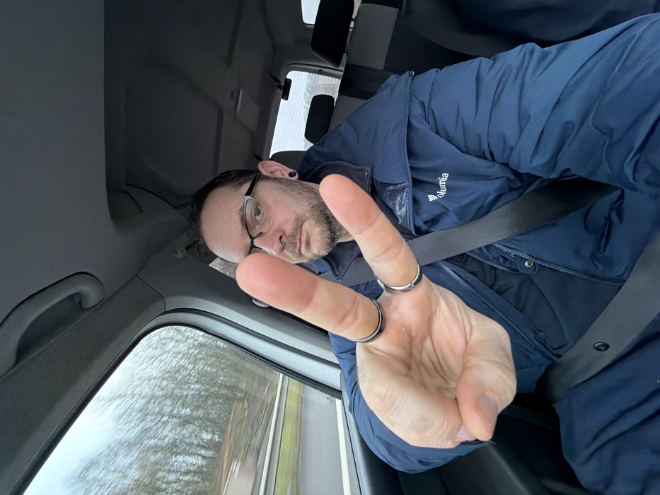An adult male is seated in the driver's position of a moving vehicle, identified as being in Mensdorf, Luxembourg. The man has short dark hair, a beard, and wears black-framed glasses along with a black ear gauge in his left earlobe. He is dressed in a dark blue Columbia-branded puffy jacket and dark trousers, secured by a dark seatbelt across his chest and lap. His left hand is raised, making a "peace" sign (V-sign) with his index and middle fingers, each adorned with a metallic ring featuring a black band. The vehicle's interior shows a light gray headliner and a dark-colored passenger seat headrest. Outside the blurred windows, a roadside environment with trees and a two-tiered guardrail (white top, dark bottom) passes by under an overcast sky, indicating the vehicle's motion. The individual is looking directly at the camera.