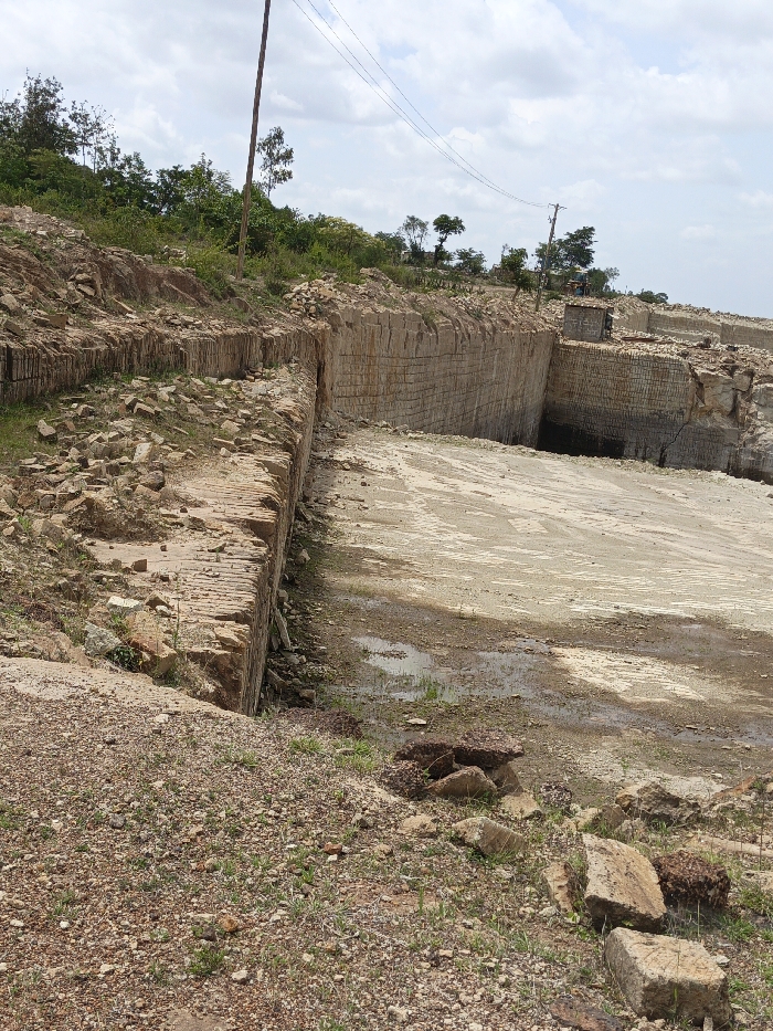 The image depicts an open-pit quarry in Kyeleni ward, Kenya, under a partly cloudy sky