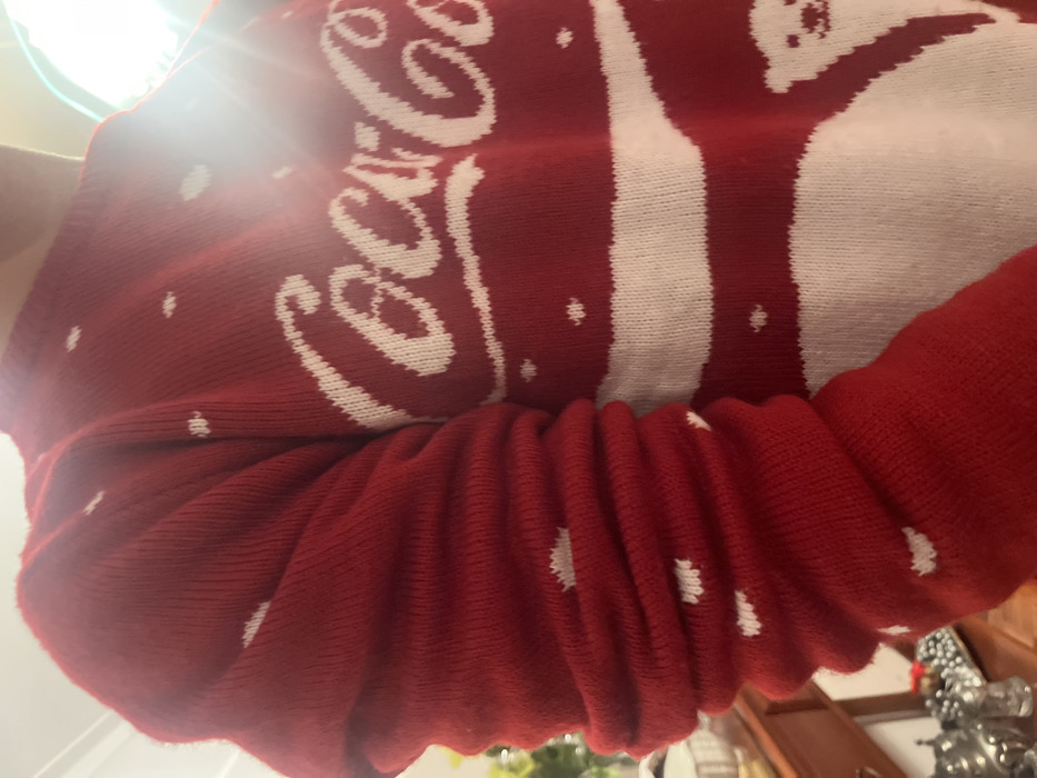 A red knitted sweater with white Coca-Cola lettering and a snowman design is shown up close