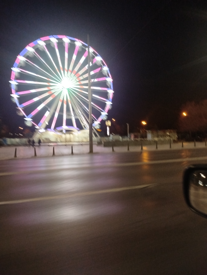 A nighttime urban scene is depicted, featuring a large, brightly illuminated Ferris wheel dominating the left side of the frame. The Ferris wheel displays multi-colored lights, predominantly pink, blue, white, and green, with a central green glow, and shows signs of slight motion blur. This attraction is located in Sofia, Bulgaria, consistent with seasonal fair setups often found near the National Palace of Culture (NDK) or Bulgaria Square. In the immediate foreground, a dark, wet asphalt road occupies the lower portion of the image, marked by two faint horizontal white lines. Reflections from overhead lights are visible on its damp surface. A partial view of a vehicle's dark side mirror is visible in the bottom right corner, suggesting the image was captured from within a vehicle. Beyond the road, a wet pedestrian area or plaza extends towards the base of the Ferris wheel. A row of dark, conical bollards serves as a barrier between the road and this pedestrian space. Indistinct, blurred human figures appear as silhouettes on the pedestrian surface, particularly beneath and to the left of the Ferris wheel's base. Further in the background, several streetlights emit an orange glow, and dark, blurred tree-like shapes or structures are visible against the dark night sky. The overall environment suggests a damp, urban setting during evening hours.