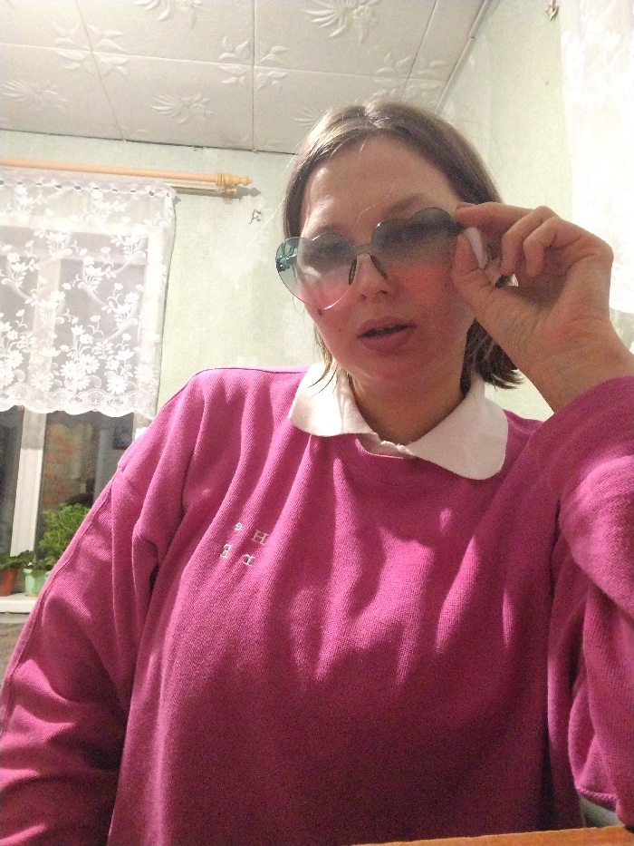 A female individual is depicted indoors, likely in a private residence in Дойная, Russia. She is shown from the chest up, facing the camera directly, holding a pair of large, light-tinted, heart-shaped sunglasses with her right hand, positioned over her eyes. Her mouth is slightly ajar. She wears a bright pink long-sleeved sweatshirt over a white collared shirt. White embroidery, appearing as Cyrillic letters ("НЯ"), is visible on the left chest area of the sweatshirt. The background features a light green wall on the left, revealing a window covered by a white, floral-patterned lace curtain. Potted plants are visible on a windowsill outside the window. A light-colored wooden curtain rod extends above the window. The ceiling is white with a textured, possibly embossed floral pattern. Lighting appears to be artificial.