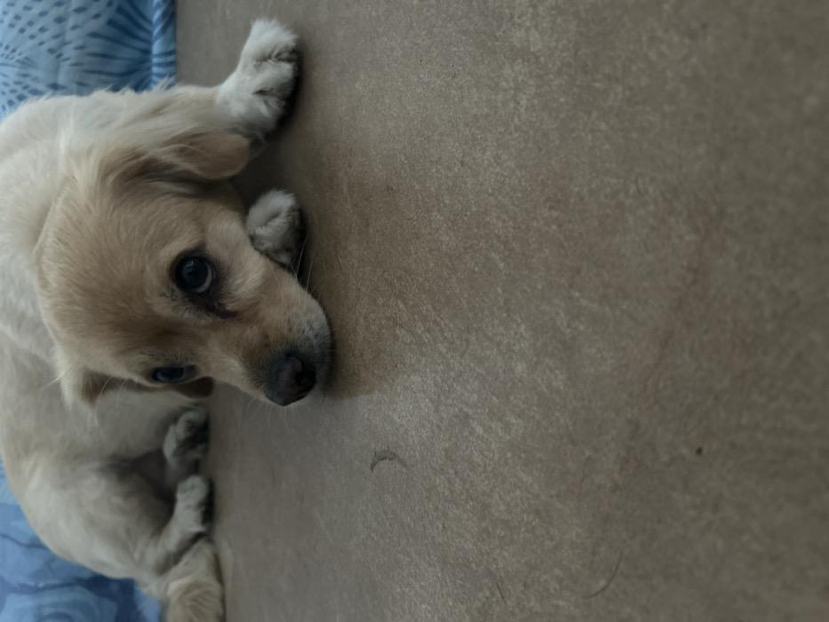 - "A small, light brown dog is lying on a tan surface" by FM-j80jY2, licensed under CC BY 4.0