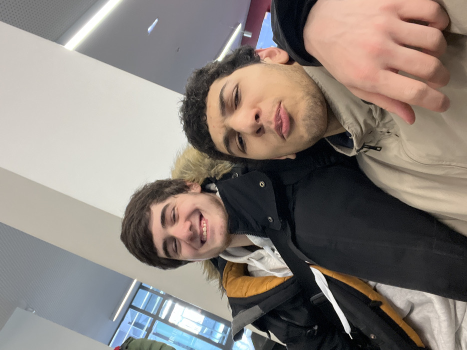 The image depicts two young adult males in an indoor setting within Schiltigheim, France