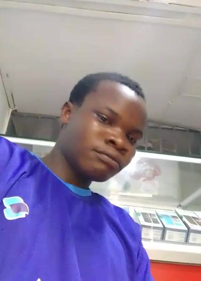 A medium shot shows a young, dark-skinned person wearing a short-sleeved purple jersey with light blue trim, looking directly at the camera. The person appears to be inside, as indicated by the white ceiling with fluorescent lighting and a display case filled with items behind them. The individual maintains a serious expression throughout the brief clip, not changing their gaze or expression. There is indistinct background noise of voices.