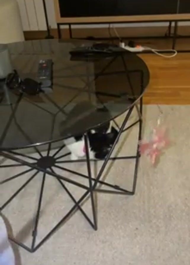 A stationary shot shows a black and white cat under a glass-topped coffee table