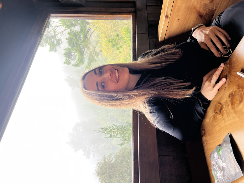 An adult female is depicted seated at a wooden table within an establishment. She has long, light brown hair, wears a black long-sleeved top, and smiles directly at the camera. Her right hand rests on the table; her left hand holds a small object with two golden rings. On the wooden tabletop to her left is a grey and green pouch labeled "Lifestyle"; a small white cylindrical object is visible in the foreground. Behind her, a large window framed in dark wood provides a view of a dense, misty forest landscape dominated by various trees. The interior features rustic wooden walls, window frames, table, and bench seating. The scene is consistent with a dining or viewing area located in the mountainous or forested regions surrounding Funchal, Portugal, such as an establishment along a levada or within a natural park accessible from the city.