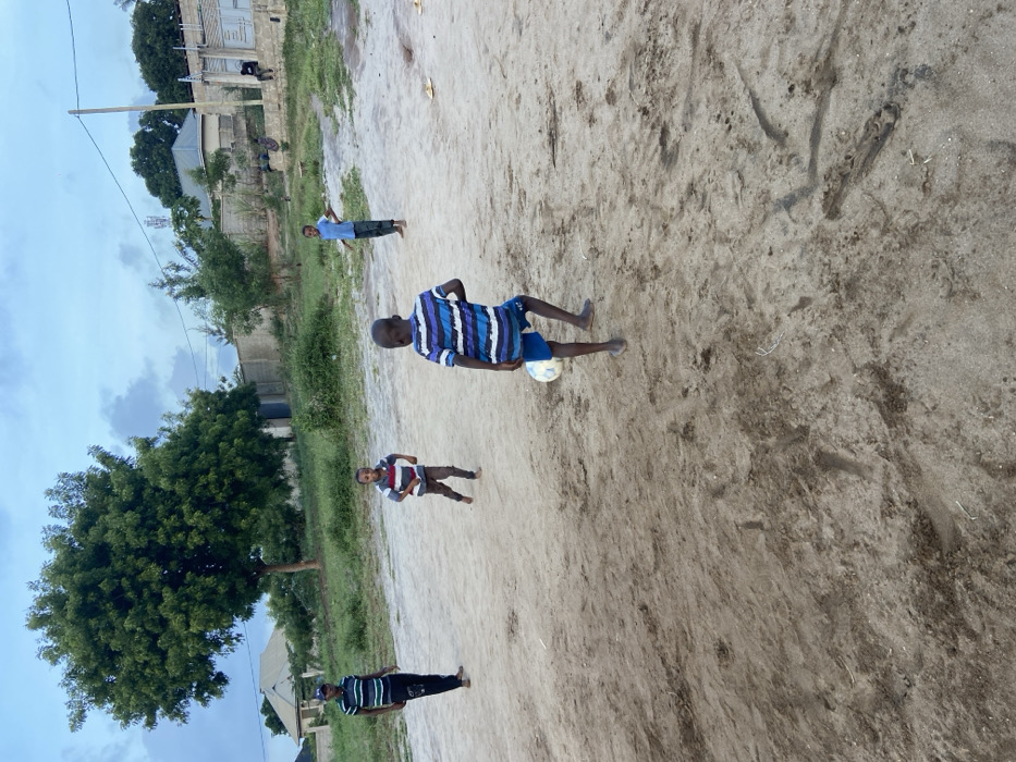 The image displays an outdoor scene in a residential or semi-residential area of Dar es-Salaam, Tanzania, under an overcast sky. Four primary individuals, all male, are present on a large, dry, light brown dirt field. In the foreground-right, a barefoot boy, approximately 6-10 years old, wearing a blue and white horizontally striped short-sleeved shirt and dark blue shorts, is actively dribbling a white and black soccer ball with his right foot, moving left across the frame. To his left, slightly further back, another barefoot boy, approximately 4-7 years old, in a red, white, and blue horizontally striped long-sleeved shirt and dark pants, runs towards the right. Further left, an adolescent or young adult, approximately 15-25 years old, wearing a green, black, and white horizontally striped short-sleeved shirt and dark pants with shoes, stands observing the scene. To the mid-right, another barefoot boy, 6-10 years old, wearing a light blue short-sleeved shirt and dark shorts, stands with hands on hips, facing left. The ground exhibits various darker patches of soil and faint impressions. In the background, green vegetation, including a large, full-canopied tree on the left, separates the field from residential structures. Several low-rise buildings, concrete walls, and fences are visible. Two additional individuals are seated on a low concrete wall in the far background on the right, observing the area. A wooden utility pole with overhead lines is also present in the distant background.