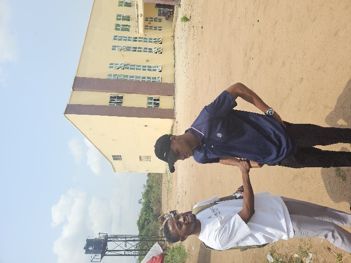 The image displays an outdoor scene in Ihiagwa, Nigeria, under a blue sky with scattered white clouds. Two young adult males of dark complexion are positioned in the foreground on an unpaved, light brown dirt ground. The male on the left wears a white short-sleeved t-shirt featuring "GIVENCHY PARIS" text, light grey trousers, a light-colored backpack, and a gold-colored necklace; he is smiling and extends his right hand. The male on the right wears a dark blue short-sleeved polo shirt with a striped collar, black trousers, a black baseball cap, and a wristwatch on his left wrist; his right hand is placed on his hip, and his left hand is clasped with the left male's right hand in a handshake gesture. In the mid-ground to the right, a large, light yellow/beige building with prominent brown vertical architectural accents and numerous white-framed windows is visible. To the far left in the background, an elevated black water tank sits atop a metal lattice tower structure. Sparse green vegetation is present in the distant background and along the left edge of the foreground.