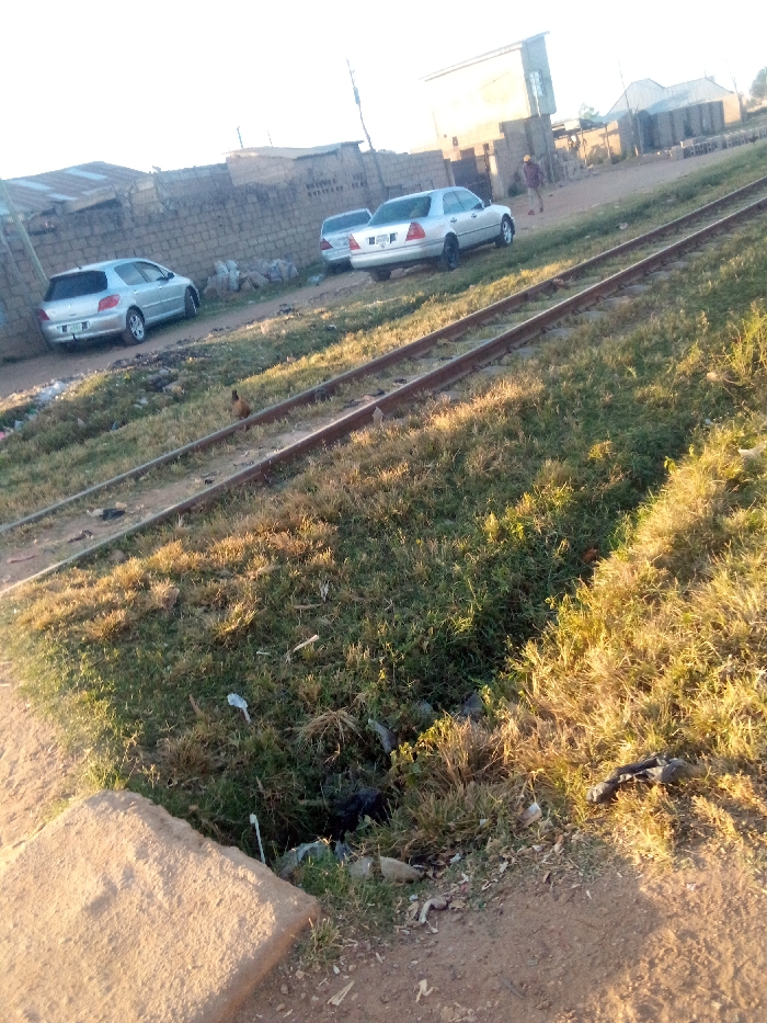The image depicts a semi-urban landscape in Bukuru, Nigeria, characterized by disused or lightly used railway tracks cutting diagonally through a grassy, unkempt area