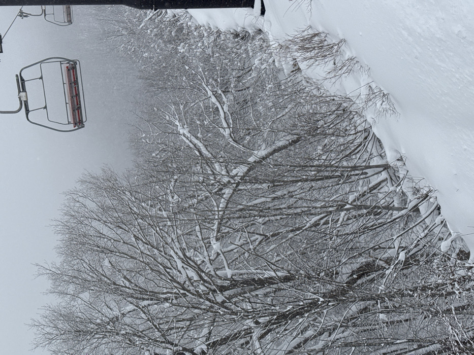 A snow-covered winter landscape features bare trees with intricate branches weighed down by snow. The scene appears to be captured from a high vantage point, possibly a ski lift, as a chairlift is partially visible. A thick blanket of snow covers the ground and clings to the vegetation, creating a stark contrast between the white snow and the dark tree branches. The overall atmosphere is serene and wintry, with a sense of quiet solitude.