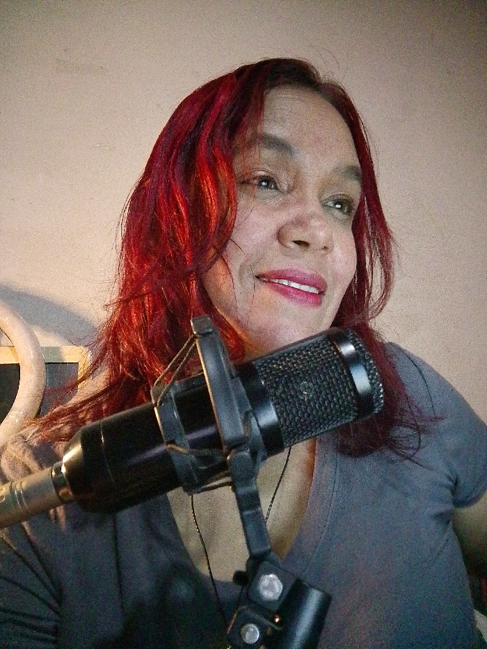 A woman with vibrant red hair smiles slightly while looking off-camera. She wears a gray V-neck shirt. A professional microphone on a stand is positioned prominently in front of her, suggesting she is recording or broadcasting. The background is a blurred beige wall, with a hint of a ring light to the left. The overall image suggests a podcasting or recording setup.