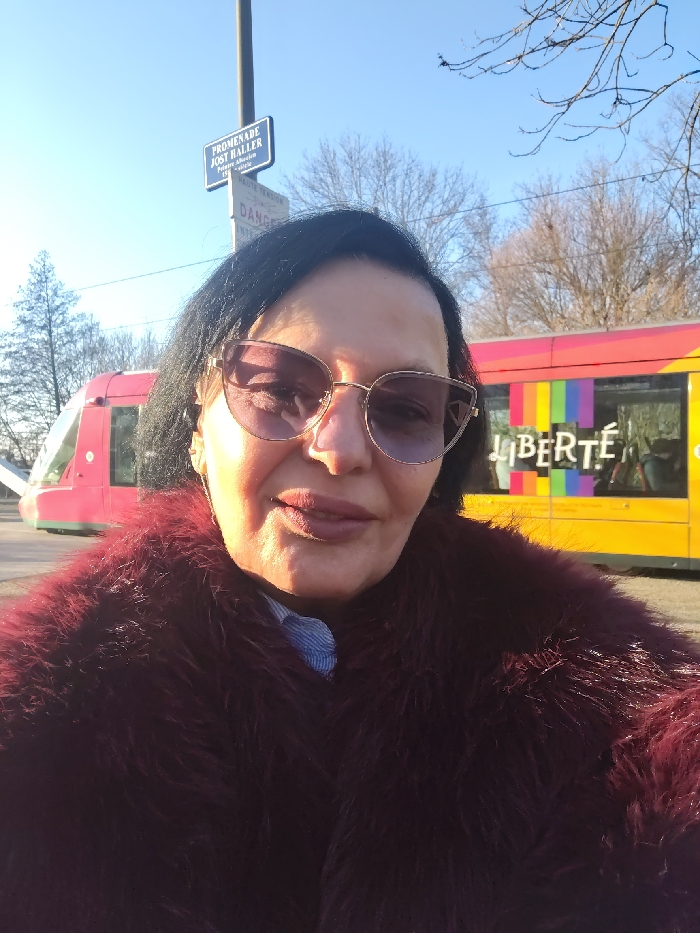 The image presents a close-up selfie of an individual, appearing female, outdoors under a clear blue sky. The person has dark hair, wears gold-framed, purple-tinted sunglasses, and a dark reddish-brown faux fur coat over a blue and white striped shirt. Muted red lipstick is applied to the lips. In the background, a dark utility pole holds a blue street sign clearly marked "PROMENADE JOST HALLER" with additional, partially obscured text below, and a red "DANGER" sign. This situates the scene at Promenade Jost Haller in Strasbourg, France. To the right of the utility pole, a tram is visible on tracks. Its front section is red, while a yellow mid-section displays a horizontal rainbow-colored stripe and the white text "LIBERTÉ". Bare trees line the distant background. Strong, directional sunlight illuminates the right side of the individual's face and casts defined shadows. The ground appears to be paved.