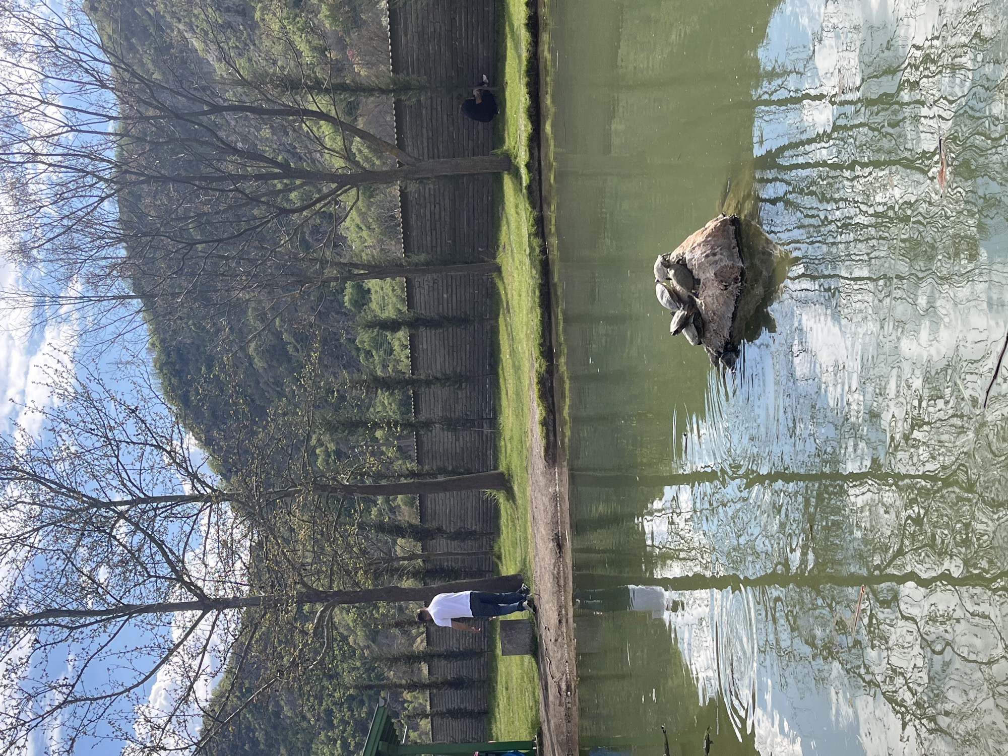 body of water, possibly a pond or lake, in General Todorov, Bulgaria. Several turtles are visible on a rock in the middle of the water. Reflections of trees and the sky are visible on the water's surface. A person is standing near the edge of the water, and another person can be seen further down the bank near some buildings. A mountain is visible in the background.