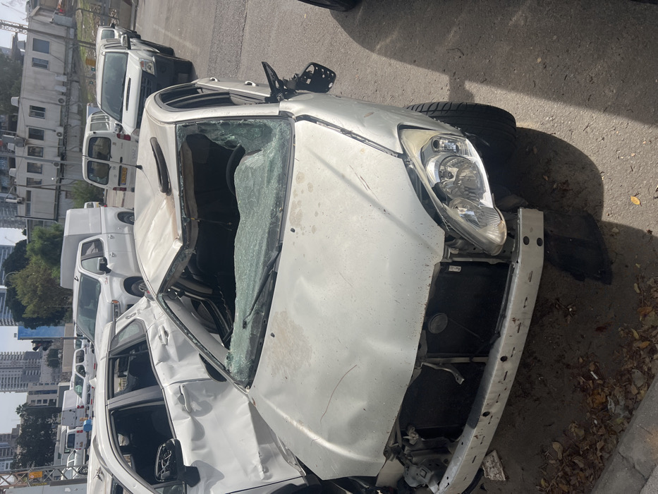 The image depicts a static scene within an outdoor vehicle storage or impound lot located in an urban environment in Tel Aviv-Yafo, Israel. The background features a mix of modern high-rise buildings characteristic of the city's skyline, alongside older, low-rise utilitarian industrial or commercial structures with flat roofs, indicating a developed area with mixed zoning. The ground in the foreground is unpaved, consisting of dirt and scattered dry leaves, with asphalt visible further back. The primary subject is a heavily damaged, light-colored sedan, likely silver or light grey, positioned centrally and facing slightly right. The vehicle's front bumper is missing, exposing the radiator and internal engine bay components. The front grille is absent. The hood is buckled, dented, and soiled with dust and grime. The windshield is completely shattered, presenting a dense spiderweb of cracks, with glass fragments visible. The roof above the front seats is severely crushed inwards, forming a large depression, and both front A-pillars are distorted. The driver's side mirror assembly is detached and hanging. The front right headlight assembly is intact but appears slightly dislodged. The car is visibly dirty from outdoor storage. To the immediate left of the central sedan, a white crossover SUV is visible, exhibiting significant impact damage to its driver's side rear door and rear quarter panel. In the background, numerous other vehicles are parked, including several white pickup trucks (some with bed covers), white commercial vans, and at least one white SUV, suggesting a collection of damaged or stored vehicles. No individuals are present, and no actions or interactions are depicted. The scene is illuminated by natural daylight, casting distinct shadows.