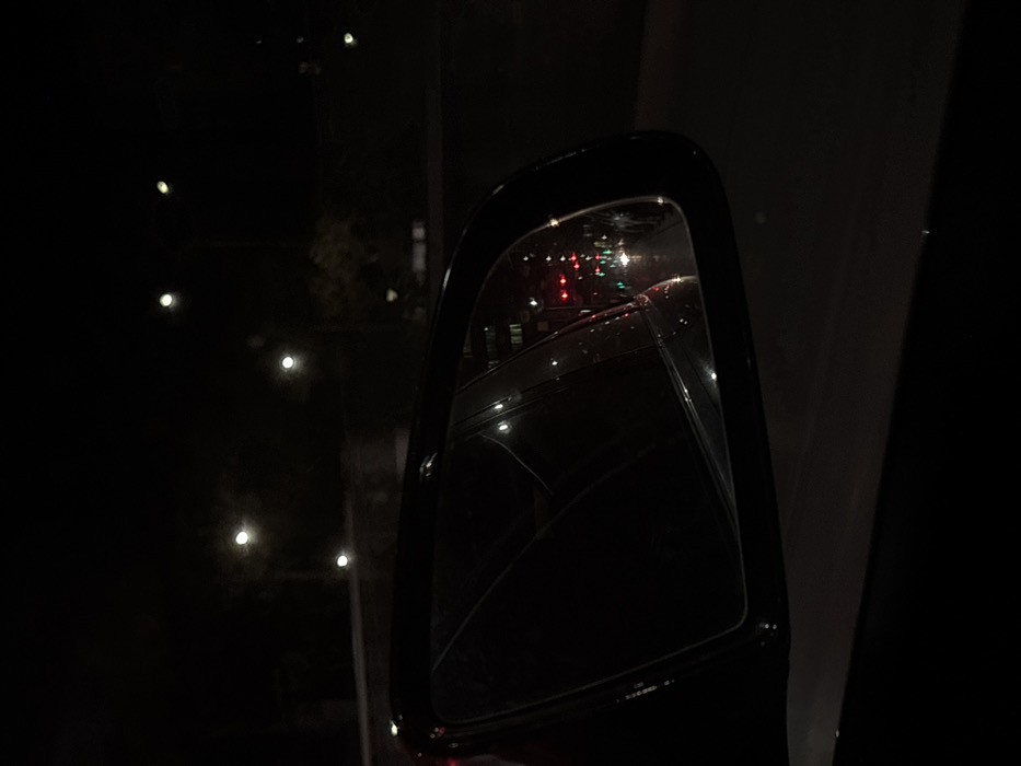 - "The image depicts a nocturnal urban scene captured from the interior of a vehicle, looking towards the passenger-side exterior rearview mirror" by FM-10ll43, licensed under CC BY 4.0