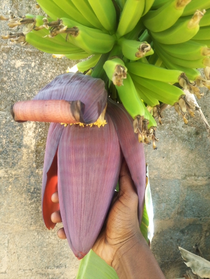A close-up, vertical shot captures a cluster of developing, light-green, unripe bananas with a prominent, conical, purplish-red banana blossom suspended below them. A dark-skinned hand is positioned beneath the blossom, gently supporting its base. The blossom exhibits several deep purplish-red outer bracts, with some yellow florets and smaller, reddish inner bracts visible where the outer layers have separated. Above the blossom, multiple hands of approximately 20-30 individual green bananas are clustered on a sturdy stem. The background is a textured, light-grey concrete or stucco wall. This scene is observed in the city of Jos, Nigeria.