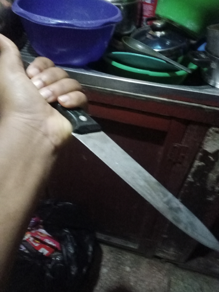 An unknown individual's right hand grips a large kitchen knife featuring a silver-toned blade and a black handle with visible rivets
