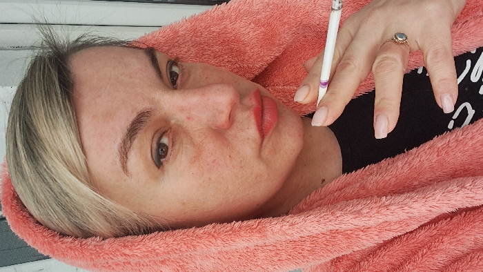 This close-up portrait depicts a Caucasian woman, approximately middle-aged, looking directly into the camera. She has blonde hair, brown eyes accentuated with dark eyeliner, and wears red lipstick. Her skin shows areas of redness and visible pores. She is clad in a coral-pink, plush, hooded garment, with a black top partially visible underneath. Her right hand, exhibiting manicured nails with light polish, holds a white cigarette with a purple band between the index and middle fingers. A gold-toned ring with a dark, oval stone is present on her right ring finger. The background is an out-of-focus, light-colored interior surface, indicating an indoor setting. The scene is located in the city of Меткомелино, Russia.